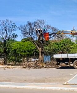 A espatódia ou tulipeira, árvore de, aproximadamente, 25 anos, morre depois da seca deste ano e é retirada pela equipe de poda da prefeitura municipal de Planaltina.
