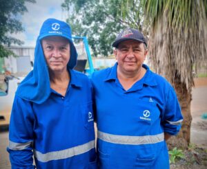 (Da esq.) Zezinho e Aloísio dois tradicionais funcionários da SANEAGO – Saneamento de Goiás S.A – em ação. Agora, no atendimento externo, conhecendo a cidade e seus pormenores desde o início, fazem a diferença.